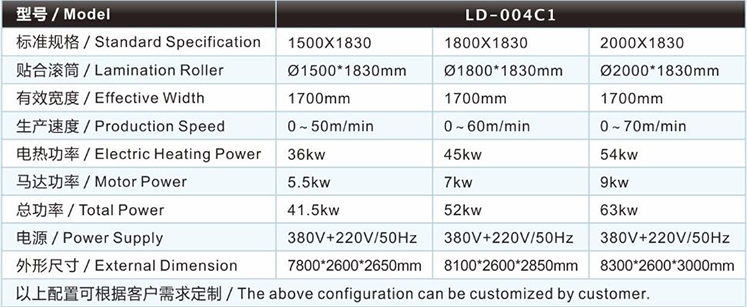 | 海綿復(fù)合機(jī)/貼合機(jī)-白膠油糊兩用復(fù)合機(jī)/貼合機(jī)LD-004C1主要技術(shù)參數(shù) / Major technical parameters |