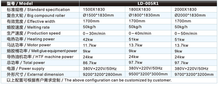 | 熱熔膠復(fù)合機(jī)/貼合機(jī)-固體顆粒熱熔膠復(fù)合機(jī)/貼合機(jī)LD-005R1 的主要技術(shù)參數(shù) / Major technical parameters |