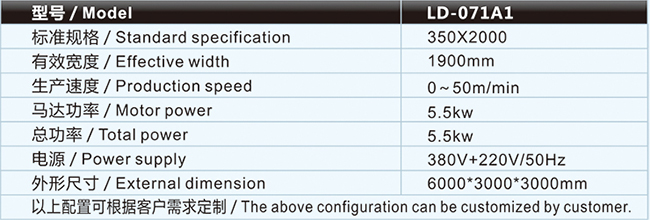 | 汽車用品復(fù)合機/貼合機-簡單型火焰復(fù)合機/貼合機LD-071A1主要技術(shù)參數(shù) / Major technical parameters |