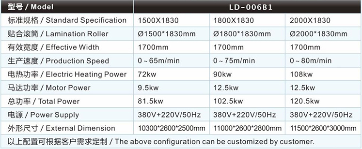 | 水膠復(fù)合機(jī)/貼合機(jī)-立式雙輪雙網(wǎng)單槽水膠高速泡棉復(fù)合機(jī)/貼合機(jī)LD-006B1的主要技術(shù)參數(shù) / Major technical parameters |